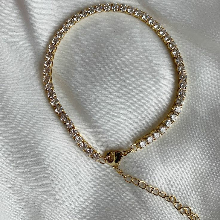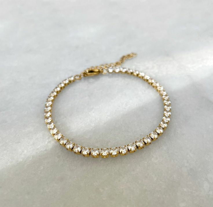 Expertly crafted with high quality base material, this adjustable tennis bracelet is perfect for any occasion. With its precise and comfortable fit ranging from 17cm to 19.5cm, it will add a touch of elegance to any outfit. Upgrade your jewelry collection with this versatile and timeless piece.gold tennis bracelet.