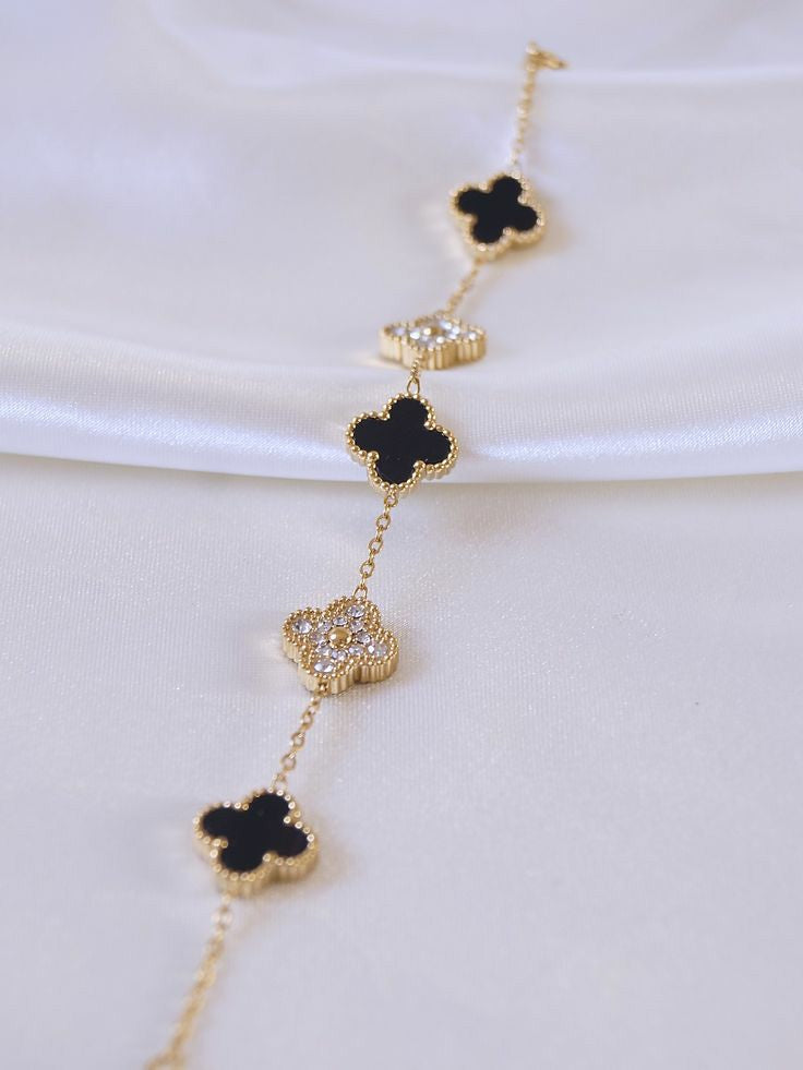 The Clover Bling 2 in 1 bracelet combines the elegant design of Vam Cleef with a touch of bling. With its versatile 2 in 1 feature, effortlessly switch between a classic black look and a dazzling one. Add a sophisticated touch to any outfit with this unique bracelet.