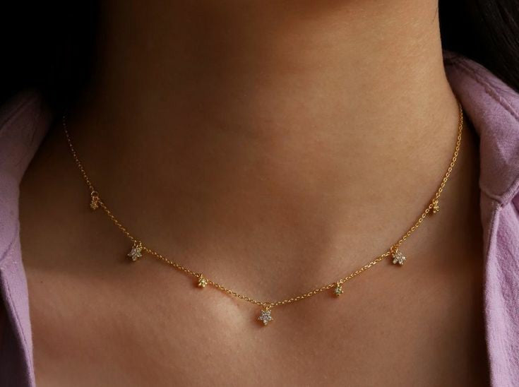 The Daisy girl necklace showcases a delicate flower design adorned with shimmering square stones. Handcrafted with care, this stunning piece adds a touch of elegance and sophistication to any outfit. A beautiful and timeless accessory, perfect for any occasion.