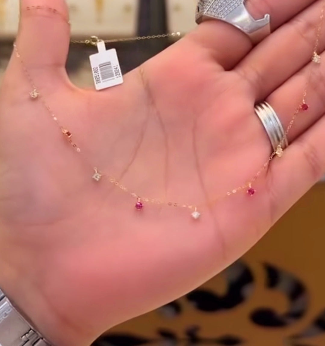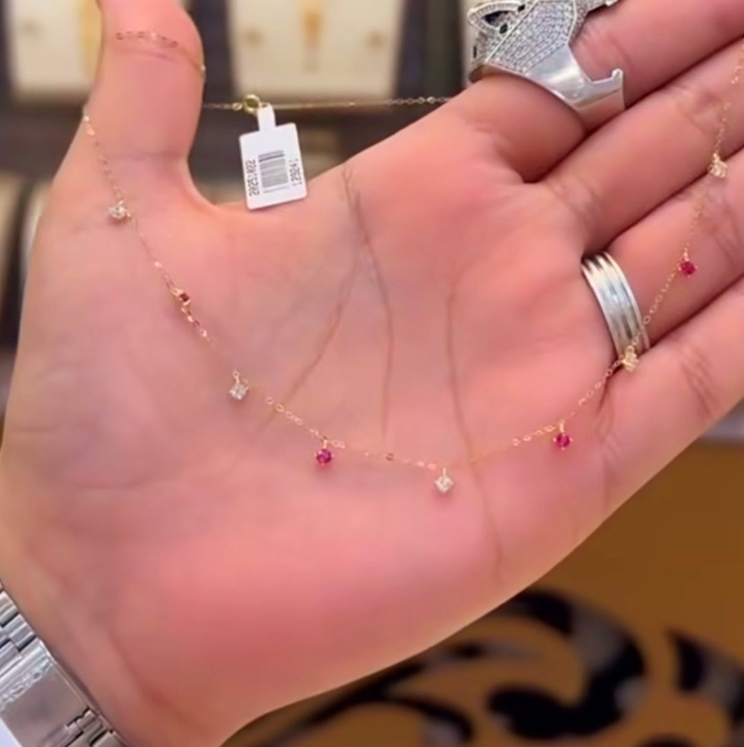 Crafted with precision, the Kovalam Ruby necklace showcases a delicate combination of small rubies and white diamonds worn by women in kovalam kingdom. The result is a stunning piece that exudes elegance and sophistication. With its intricate design and quality materials, this necklace is sure to make a statement wherever you go.
