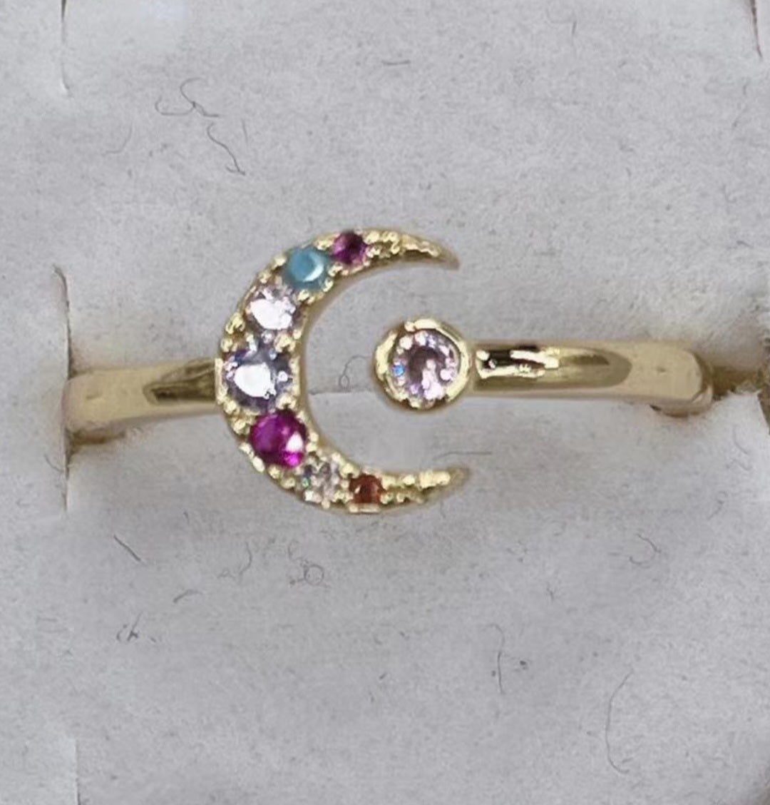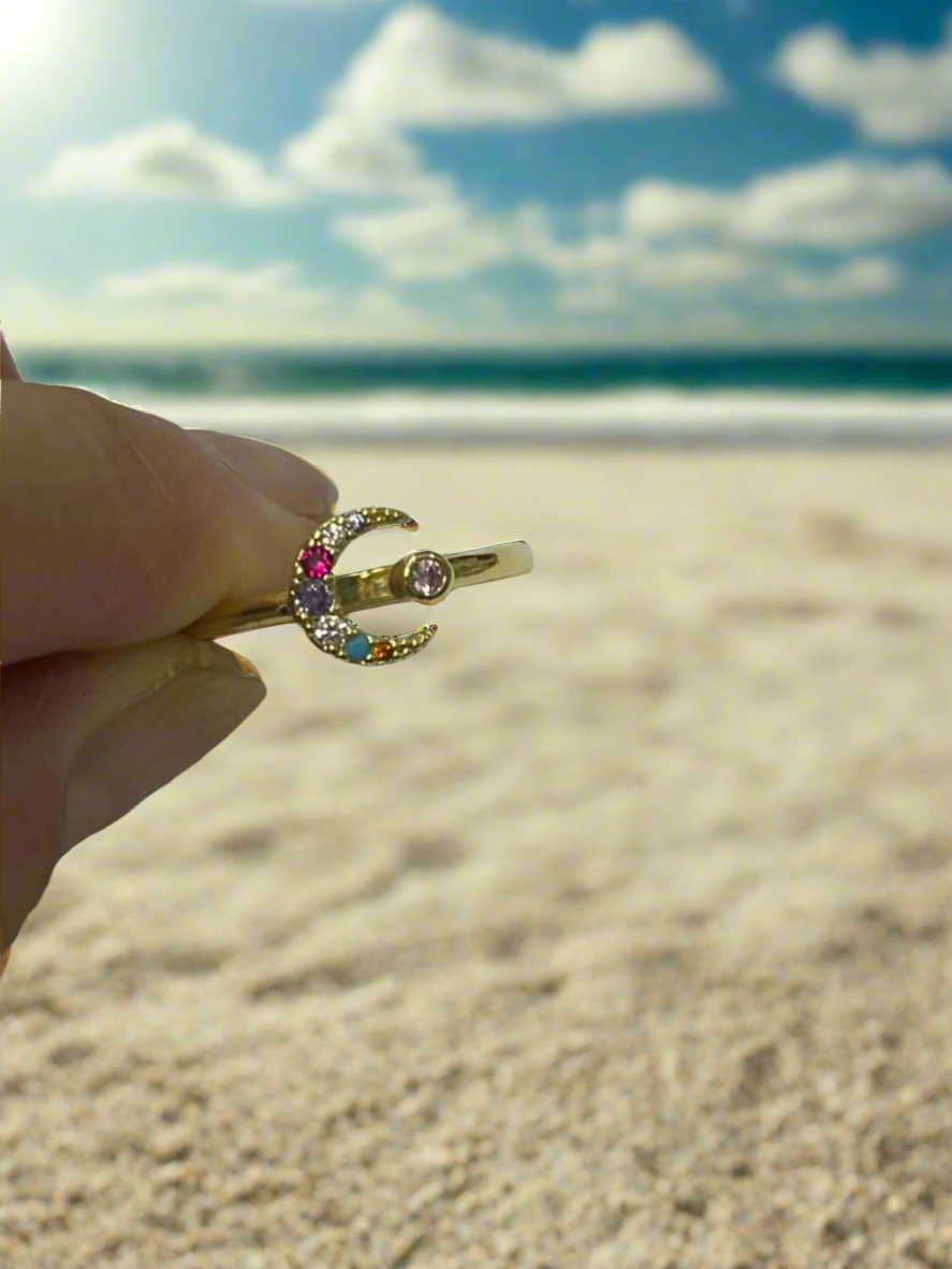 Enhance your attire with our Multicolour Moon Ring featuring a dazzling moon in a variety of vibrant colours. Made with high-quality materials, this ring is sure to make a statement and bring a touch of celestial beauty to your look. Perfect for any occasion, this unique piece will add a touch of glamour to any outfit.