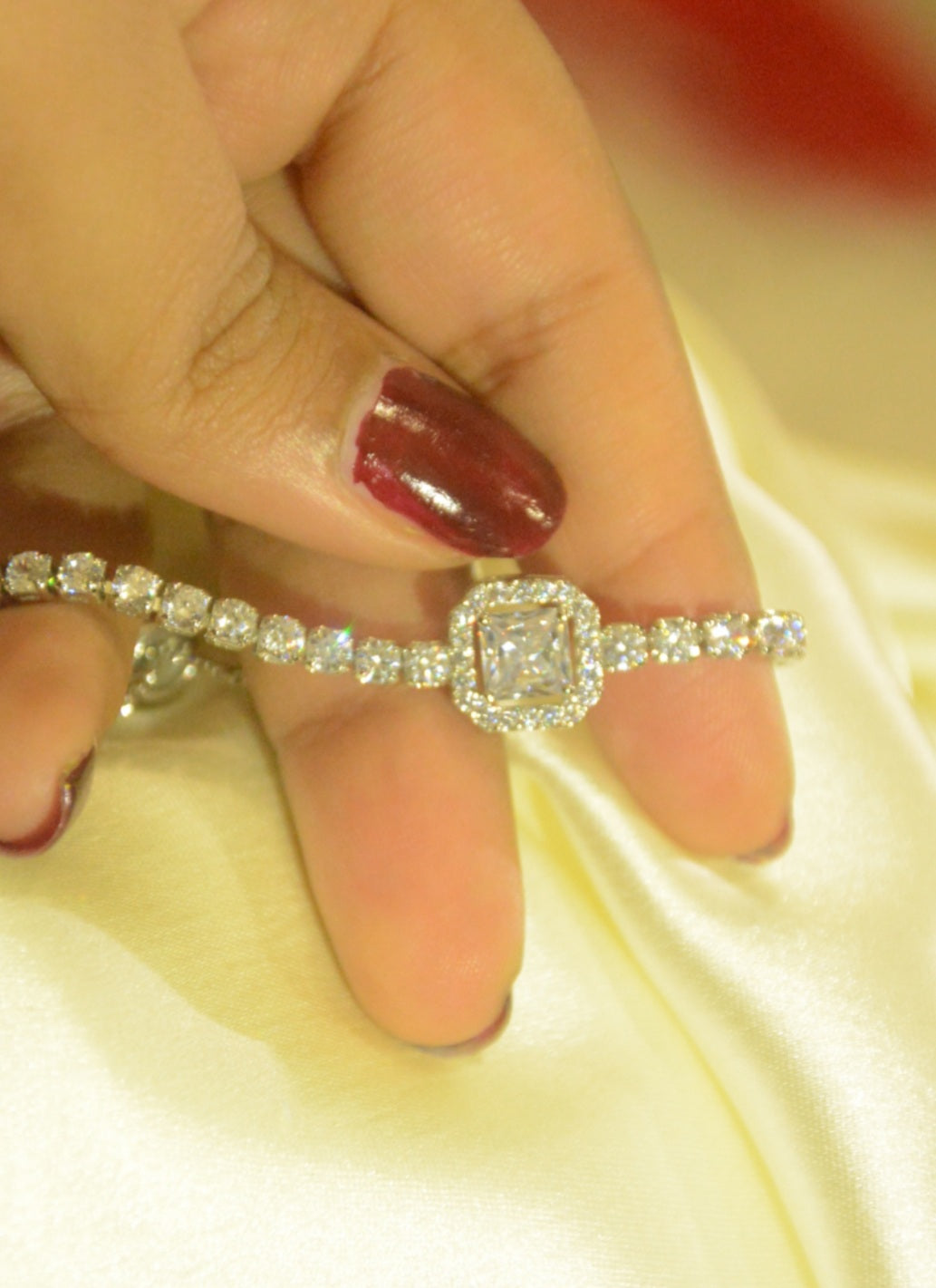 Update your formal attire with our Square Tennis Classy Bracelet. Featuring a unique square design, this bracelet will add a touch of elegance and sophistication to your outfit. Crafted with precision and quality, this bracelet is the perfect accessory for any formal occasion. Secure it with the lock for a stylish and secure look. Upgrade your style today with our Square Tennis Classy Bracelet.