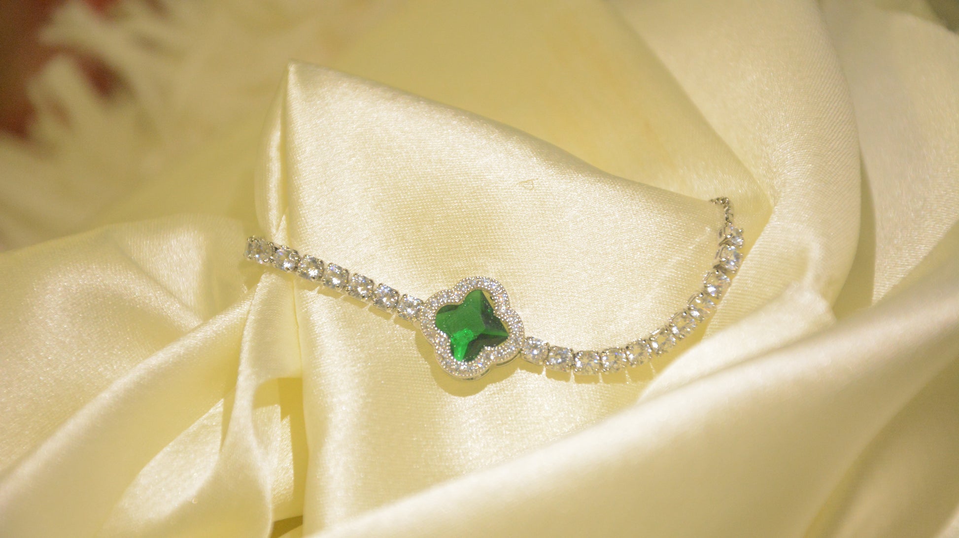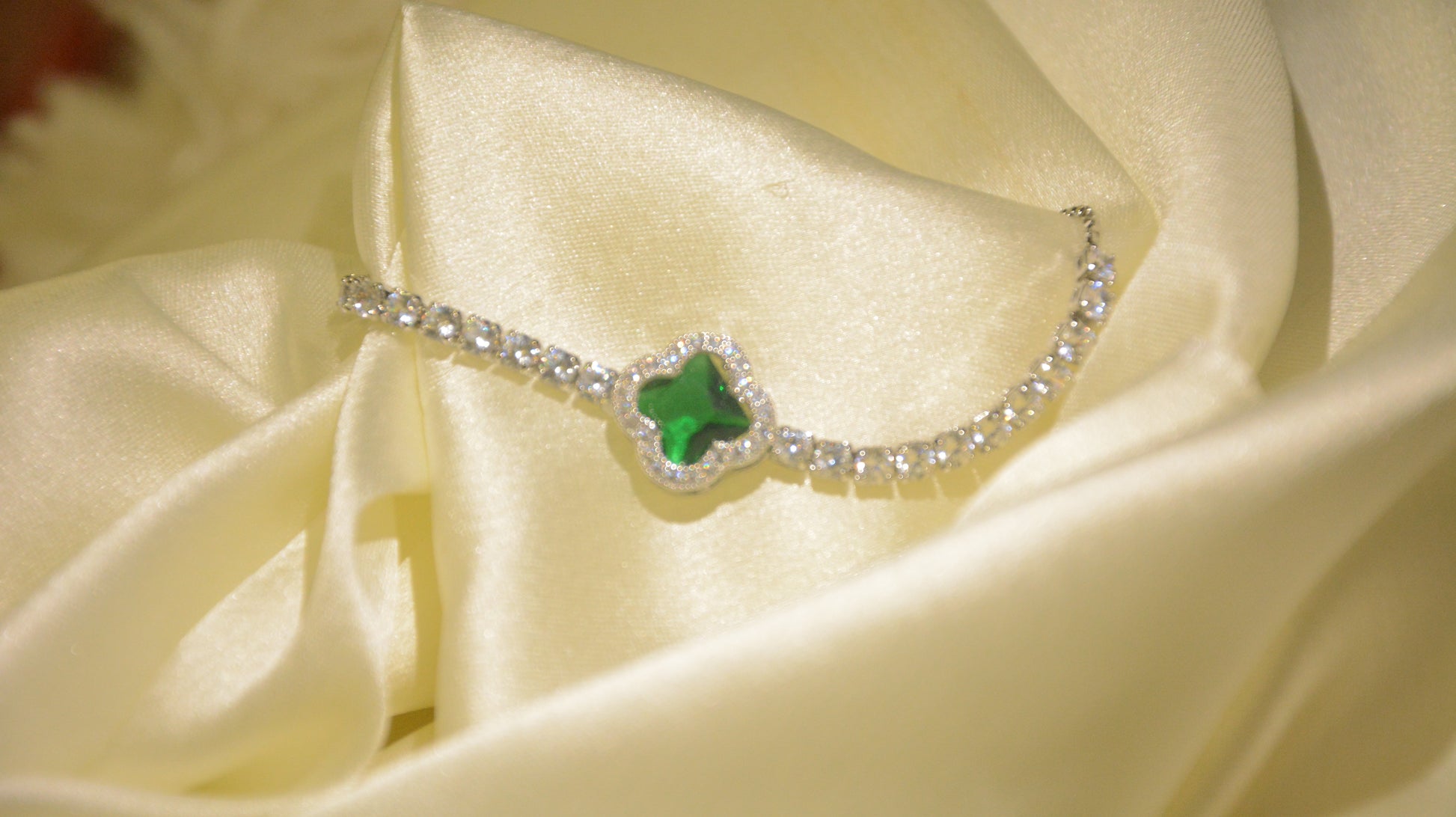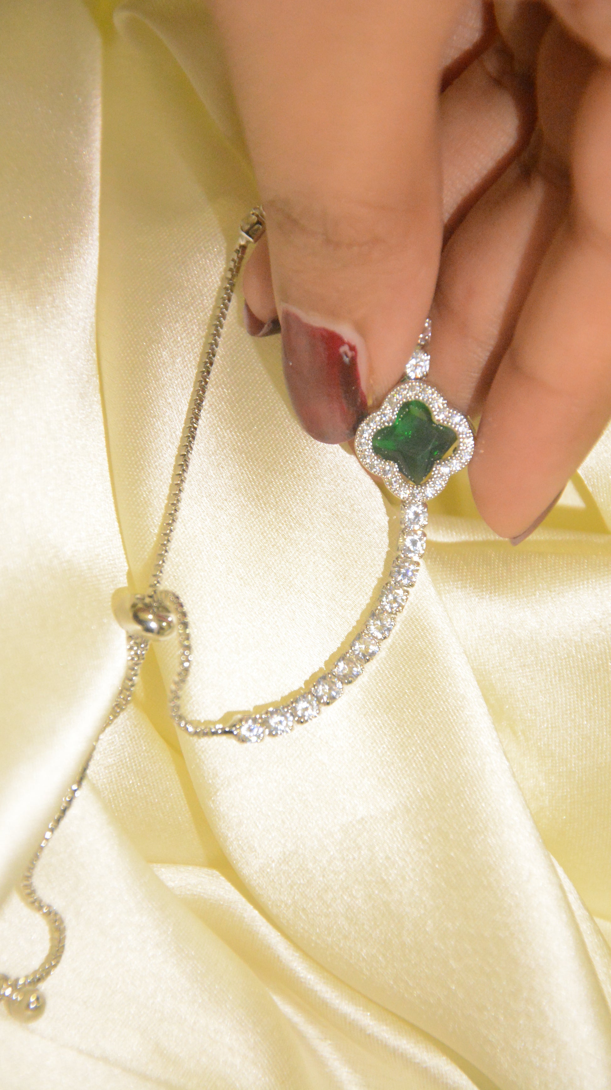 Silver colour tennis stones and metal with emerald clover stone