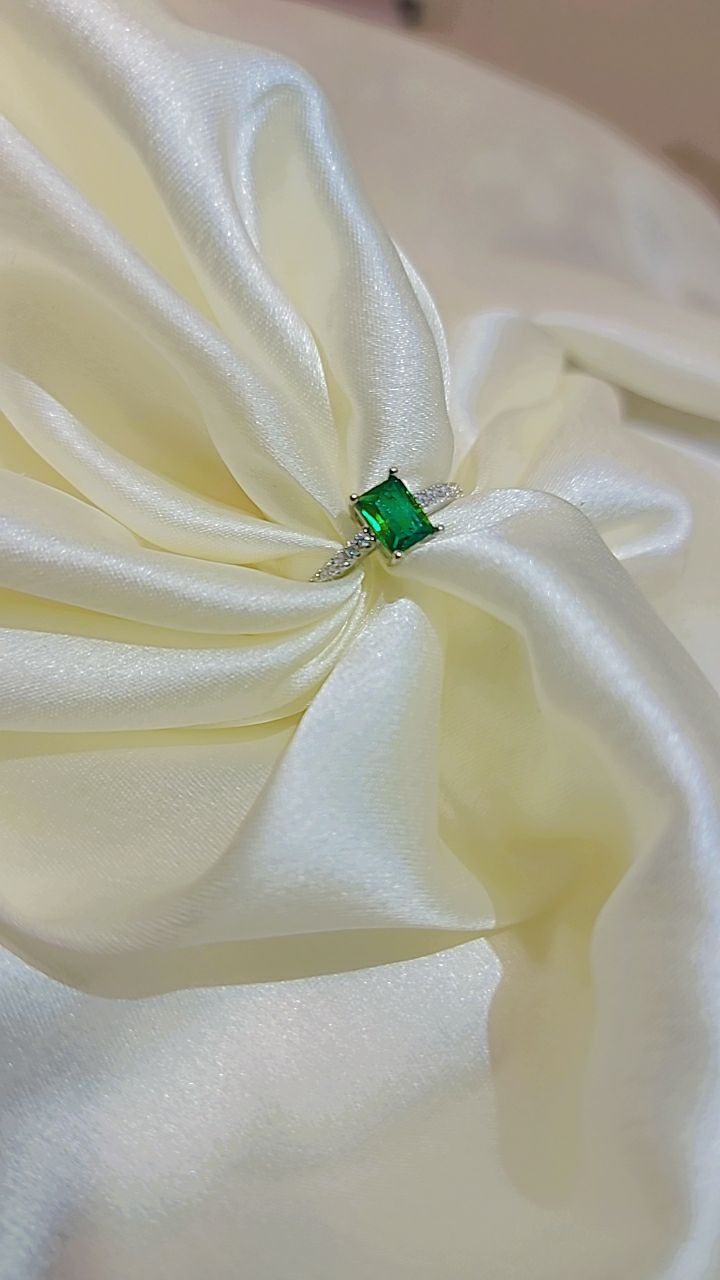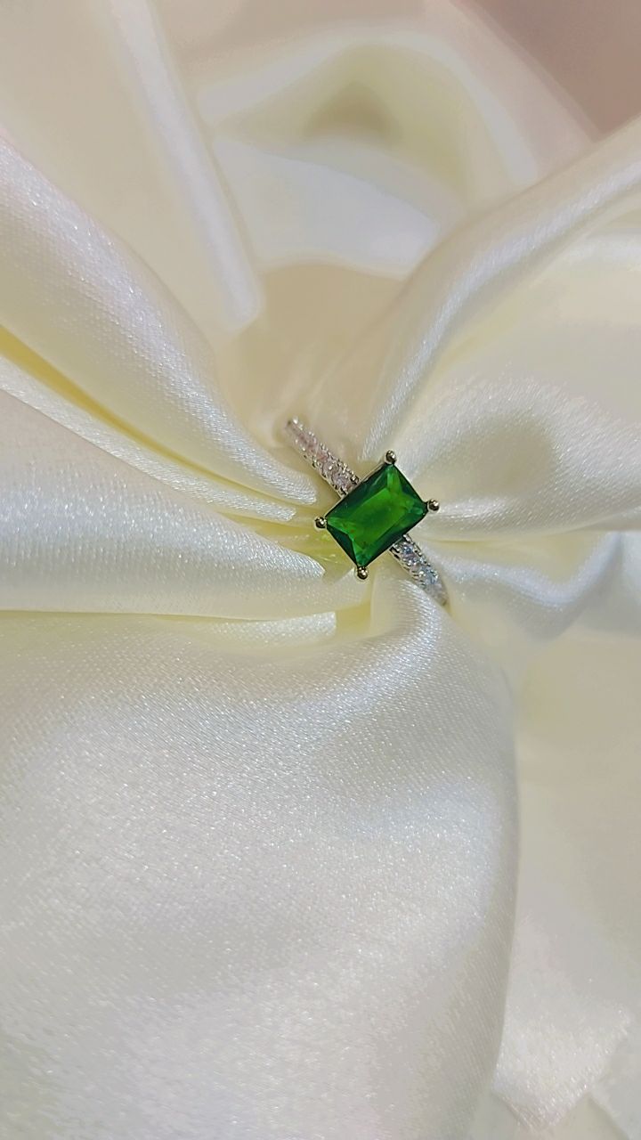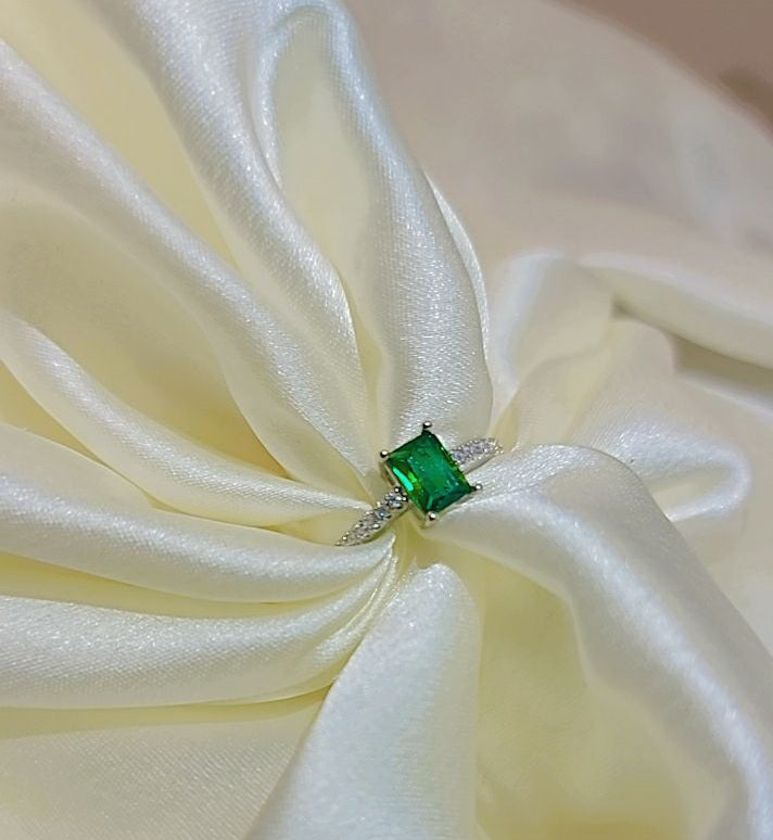This 4cut emerald stone adjustable ring is crafted with a beautiful and eye-catching rectangle silver bling stone on side Its adjustable design ensures the perfect fit for anyone and makes a perfect gift. Enjoy its timeless elegance with a contemporary flair.